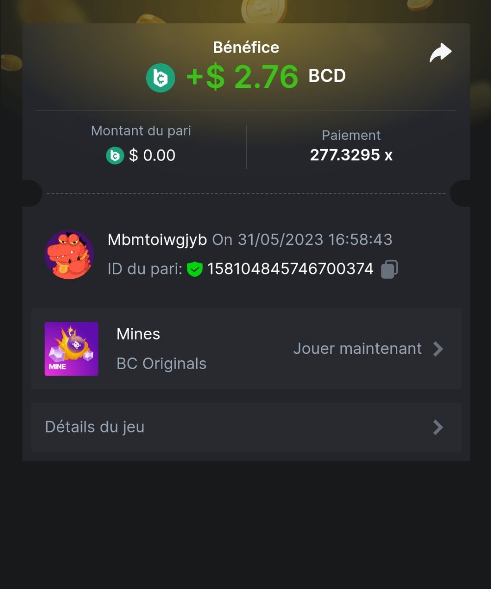 Maksypro Posted May 31, 2023 Share Posted May 31, 2023 Read Carefully Before Start To Hunt Daily Challenges #252 MINES Hunt : Win the highest multiplier Min Multiplier requirement 100x Min Level 4 ๏ธDuration Starting : Now End time : 23.59 UTC Time How to Join? Make screenshot + paste your bet link + UID or Profile link Any coin, with min bet 0.01 USD is allowed (jb/bb/bcl not allowed) Reward Prizes 1st Place.....$7 BCD 2nd Place.....$5 BCD 3rd Place.....$4 BCD 4th Place.....$3 BCD 5th Place.....$2 BCD ๐ต Winners will be announcing next day after Roll Point! 3 Link to comment Share on other sites More sharing options...