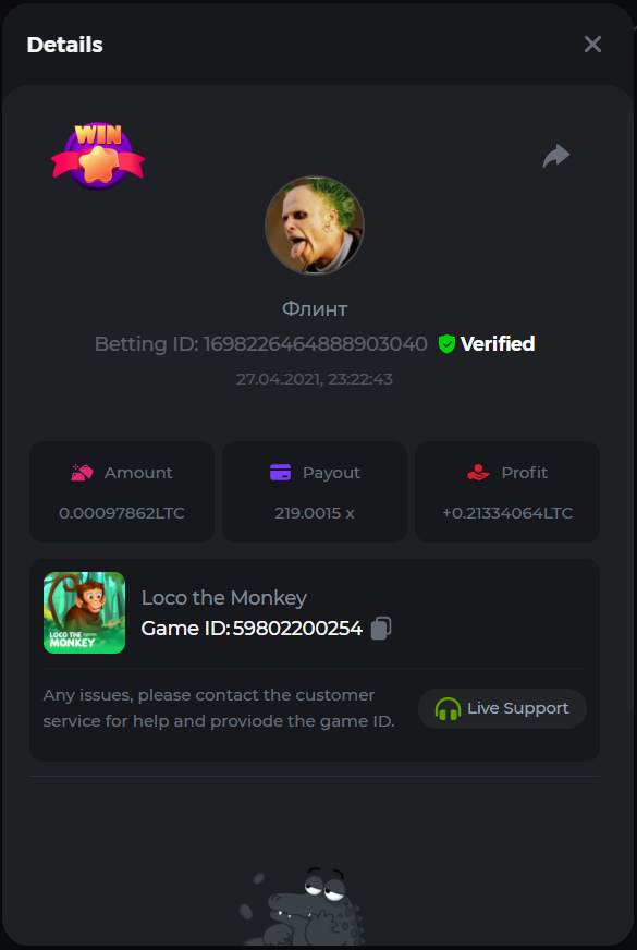 RokitaForfiterrr Posted April 26, 2021 Share Posted April 26, 2021 Loco the Monkey-Win Bet id: 59670341714 26.04.2021, 17:16:57 Link to comment Share on other sites More sharing options...